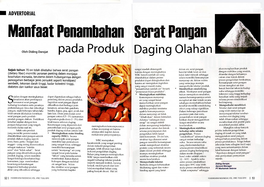 Seperti yang telah diterbitkan oleh majalah FoodReview Indonesia ( penulis : Bapak Diding Darojat, General Manager PT. Markaindo Selaras), bahwa Sejak tahun 70-an telah diketahui bahwa serat pangan (dietary fiber) memiliki peranan penting dalam menjaga kesehatan manusia, terutama dalam hubungannya dengan pencegahan berbagai jenis penyakit seperti konstipasi/sembelit, tekanan darah tinggi, kadar kolesterol tinggi, diabetes dan kanker usus besar.