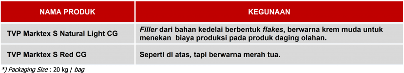 TVP MarkTex S adalah TVP special grade yang dibuat secara ekslusif untuk PT. Markaindo Selaras. Kelebihan TVP MarkTex S dibanding produk sejenisnya antara lain memiliki kemampuan untuk menyerap air sebanyak 3 kali dari bobotnya sendiri, aroma bau langu kedelai (beany flavor) yang tidak terlalu kuat serta telah memiliki sertifikat Non-GMO yang menyatakan bebas dari bahan-bahan hasil rekayasa genetika atau GMO. MarkTex S menawarkan TVP dengan beragam ukuran (particle size) mulai dari powder / bubuk sampai granular dengan ukuran 1 - 7 mm serta memberikan beragam pilihan warna yaitu natural (krem), natural light (krem muda), caramel light (kecoklatan) dan merah.