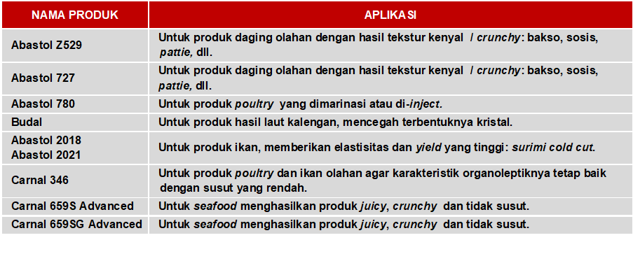 Menghasilkan tekstur produk yang empuk dan kenyal dengan rasa dan juiciness yang tetap alami setelah proses pemasakan.