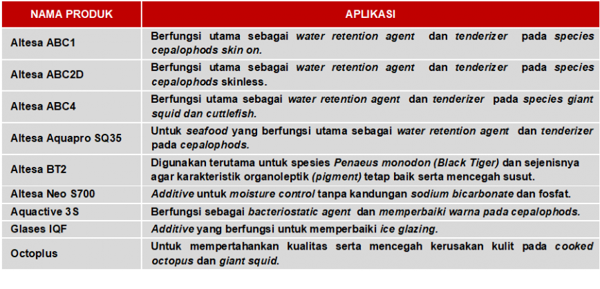 Konsep Budenheim adalah memperbaiki kualitas hasil laut setelah panen. Setiap spesies hasil laut memerlukan perlakuan tersendiri. Budenheim memiliki produk lebih lengkap tidak hanya berbahan dasar fosfat tetapi juga asam sitrat dan bahan natural yang bersifat clean label. Konsumen dapat memilih produk Budenheim sesuai kebutuhan dan yang diminta oleh buyer mereka. Secara umum bahan tambahan Budenheim dapat di kategorikan sebagai moisture management, color improvement dan bacteriostatic agent.