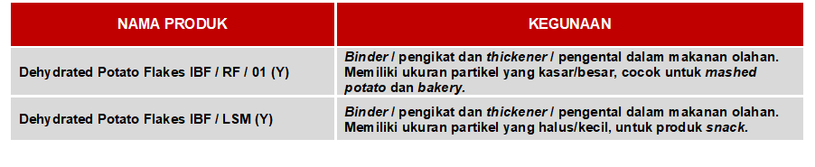 Iscon Balaji Foods (IBF) yang didirikan pada tahun 2012 merupakan produsen potato flakes terkemuka di tingkat global yang berlokasi di India. Pertanian kentang IBF meliputi lahan seluas 5.000 hektar dan melibatkan lebih dari 1.000 petani. Pabrik potato flakes IBF berlokasi di Anand, setiap harinya menghabiskan 200.000 kg kentang sebagai bahan baku produksinya. Bisnis kentang IBF yang mencakup dari hulu ke hilir memberikan keunggulan tersendiri karena IBF bukan saja dapat menjamin ketersediaan pasokan tetapi juga dapat memastikan bahwa produk-produknya sampai di tangan pembeli dengan kualitas terbaiknya. Produk potato flakes IBF telah memiliki sertifikat mutu standar Internasional seperti sertifikat FSSC 2000 dan sertifikat BRC, bahkan IBF juga telah mengantongi sertifikat halal yang diakreditasi oleh MUI (Majelis Ulama Indonesia) / BPJPH (Badan Penyelenggara Jaminan Produk Halal).