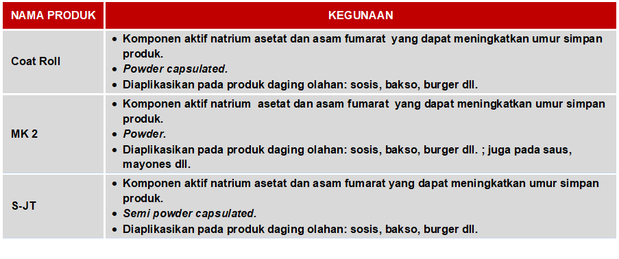 Produk Koyo dapat diaplikasikan untuk produk pangan seperti produk olahan daging, bakery, saus dan produk pangan lainnya. Penggunaan produk Koyo yang bersifat alami dengan sentuhan modernisasi yang sesuai dengan kondisi industri saat ini menjadikan masa simpan makanan menjadi lebih lama dan aman dikonsumi. Koyo menyebutnya dengan “food longevity agent” dan dikategorikan sebagai acidulant / acidity regulator atau pengaturan keasaman.