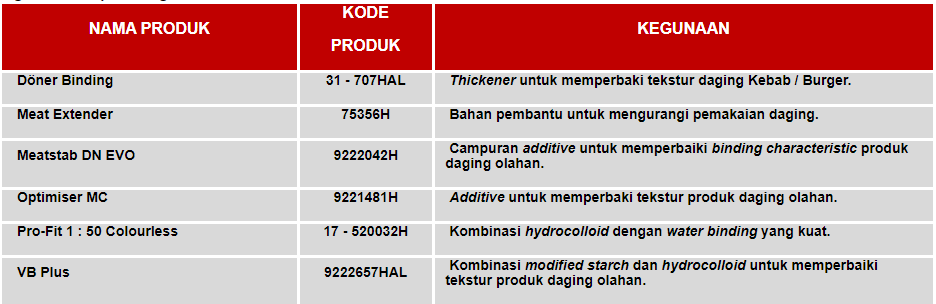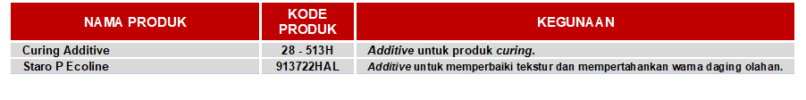 Combi products yaitu campuran bumbu dan bahan tambahan makanan untuk produk-produk daging olahan tertentu. Produk combi ini sangat praktis dalam penggunaannya karena hampir semua bumbu dan bahan tambahan sudah terkandung di dalamnya. Selama proses produksi hanya garam dan natrium nitrit / nitrat yang perlu ditambahkan secara terpisah.