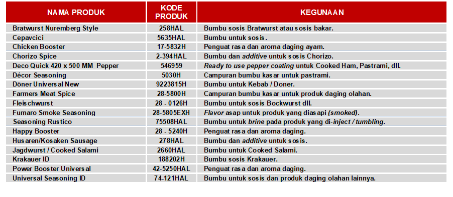 Campuran bumbu untuk produk-produk daging olahan tertentu. Setiap campuran bumbu diberi nama sesuai dengan produk daging olahannya.