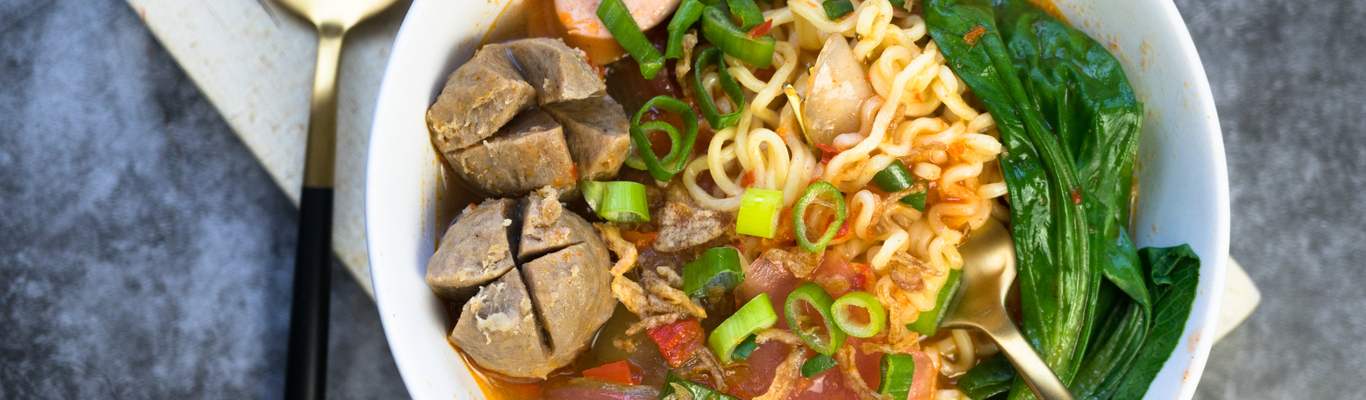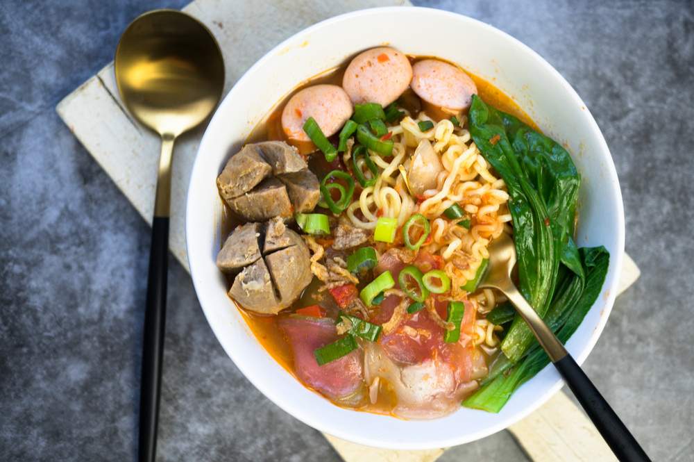 - Daun bawang dipotong-potong dan campur dengan makaroni, kerupuk, bakso, serta sosis. Tumis dengan bumbu yang telah ditumis sebelumnya.